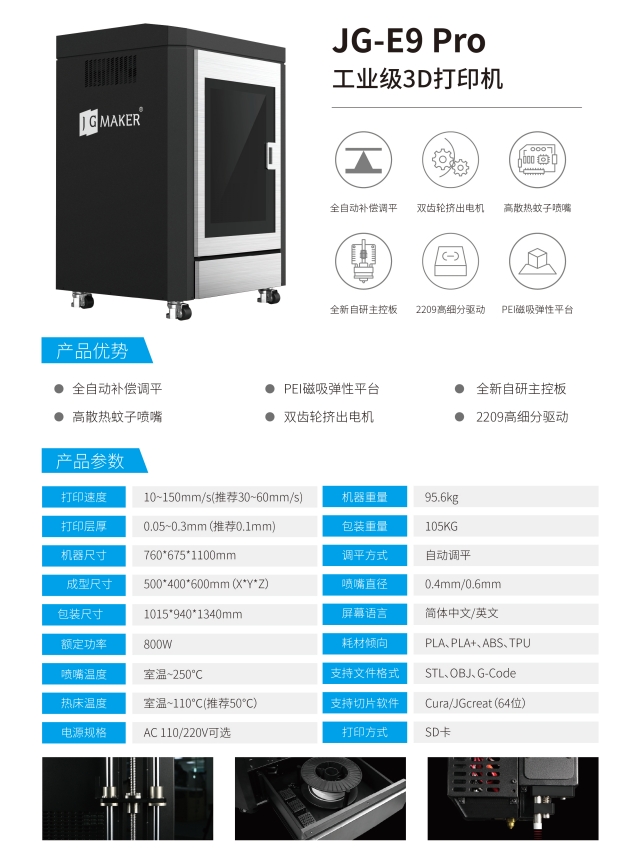 極光創(chuàng)新JG-E9 Pro作為極光創(chuàng)新工業(yè)級(jí)FDM系列3D打印機(jī)的王牌產(chǎn)品,在教育科研、工業(yè)制造等領(lǐng)域深受好評(píng),除了擁有500*400*600mm的較大成型尺寸之外,全封閉空間的鈑金結(jié)構(gòu)機(jī)身,不僅可以很好的控制機(jī)箱溫度,有效提升打印精度。同時(shí),該款機(jī)器的內(nèi)置配置也是直接拉滿,集成化設(shè)備管理系統(tǒng)、先進(jìn)的熱感控制系統(tǒng)、四軸靜音驅(qū)動(dòng)主板、大流量高散熱蚊子噴頭等齊全的內(nèi)核配置,全方位保障3D打印模型的成型率。
