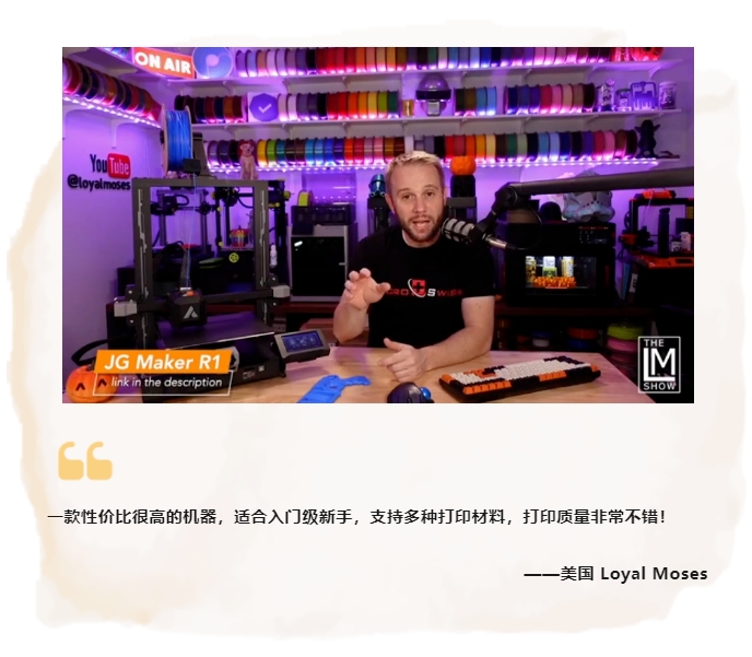 最近幾個月,極光創(chuàng)新R1憑借其極具人性化的簡單設(shè)計和高精度的打印質(zhì)量,被海外市場一致認(rèn)為是最具性價比的入門級3D打印機,受到眾多消費者的喜愛,許多權(quán)威人士和社媒博主都對這款3D打印機給予了高度評價,認(rèn)為它是入門級用戶的理想選擇。